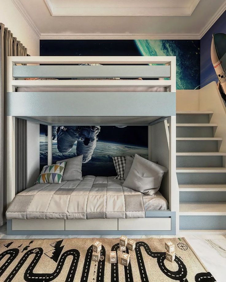 Desain ini cocok untuk dua anak laki-laki yang berbagi satu kamar. Tempat tidur tingkat klasik biasanya terdiri dari dua tempat tidur yang ditumpuk vertikal, dengan tangga di samping.