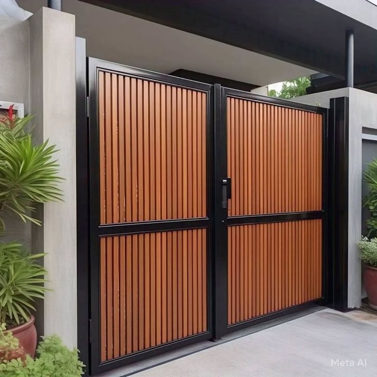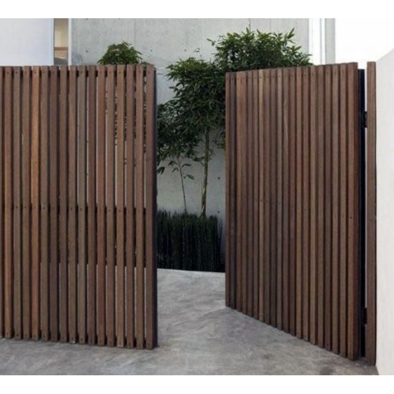 Jika ingin menggabungkan ketahanan dengan keindahan, desain pagar kayu + besi adalah jawaban terbaik. Rangka besi memberi kekuatan tambahan, sementara kayu memberikan kesan hangat yang membuat tampilan keseluruhan lebih seimbang.
