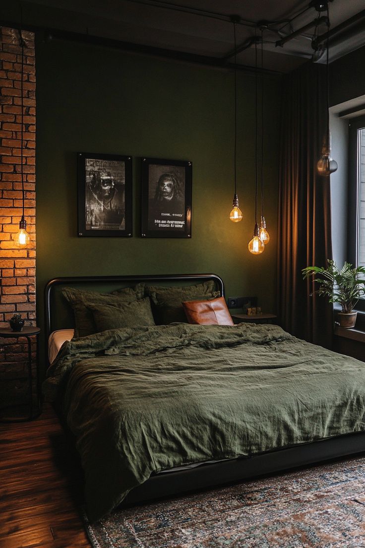 Hijau zaitun atau olive green memang tidak terlalu umum untuk industrial, namun justru membuat ruangan tampak lebih unik dan berkarakter. Warna ini memberikan sentuhan earthy yang menyeimbangkan material keras seperti besi dan beton.