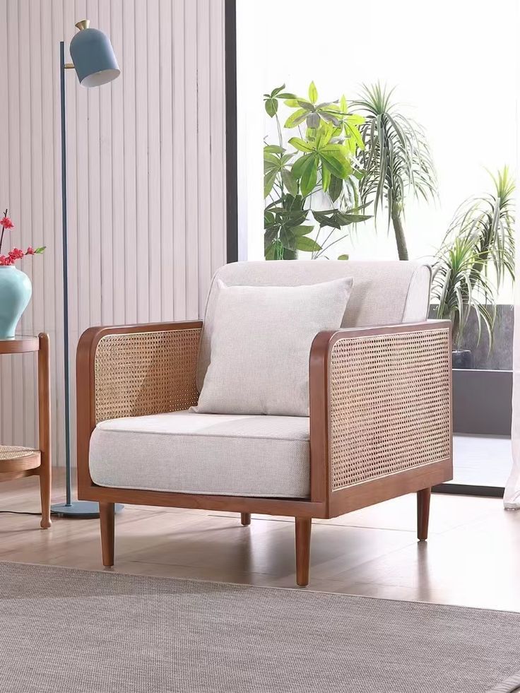 Serat rotan menghadirkan nuansa alami yang lembut dan ramah. Kursi ini menciptakan atmosfer rileks yang sangat cocok untuk ruang tamu. Berbeda dengan kursi berbahan kayu solid atau besi, kursi rotan jauh lebih ringan.