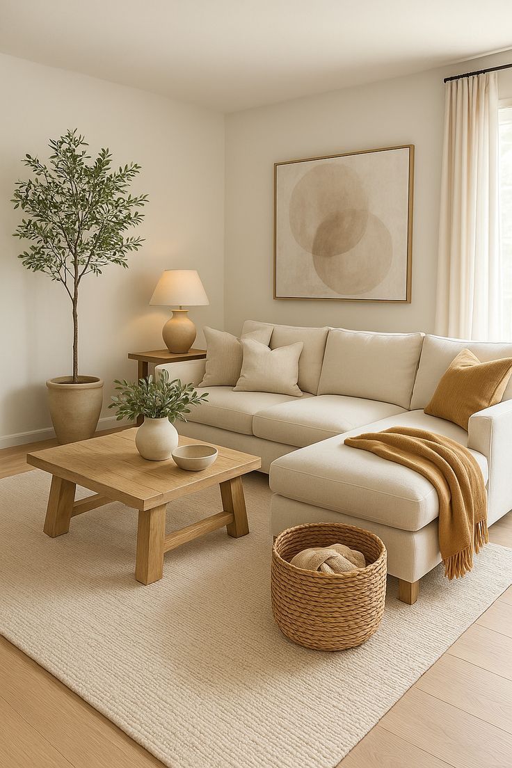 Untuk memperkaya tampilan, tambahkan warna aksen yang lebih gelap seperti navy, charcoal, atau cokelat tua pada bantal, vas, atau dinding aksen. Kombinasi warna lembut dan hangat ini akan memberikan kesan tenang dan menenangkan pada ruangan.