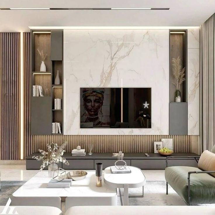 Penggunaan material seperti panel kayu, batu alam, marmer, atau finishing HPL dapat memberikan karakter yang berbeda-beda pada ruangan. Misalnya, panel kayu menghadirkan kesan hangat dan natural, cocok untuk menciptakan suasana keluarga yang nyaman. Sementara itu, material marmer atau finishing glossy dapat memberikan sentuhan mewah dan modern.