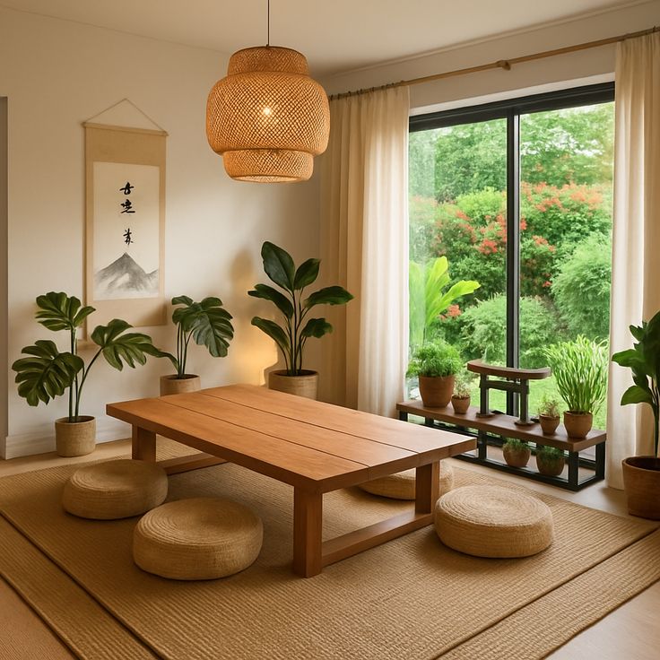 Desain Japandi identik dengan kesederhanaan, warna natural, dan furnitur rendah. Kombinasi karpet tebal, cushion besar, dan meja kayu rendah bisa menciptakan suasana yang calm dan cozy.