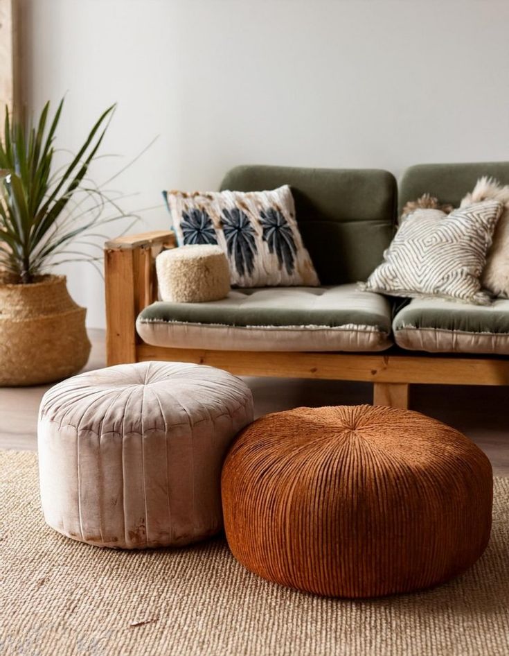 Kalau kamu tetap ingin ada tempat duduk tapi tidak ingin sofa besar, layout dengan 1 sampai 2 armchair dan pouf bisa jadi pilihan. Tata berhadapan atau membentuk sudut untuk menciptakan area ngobrol yang nyaman.