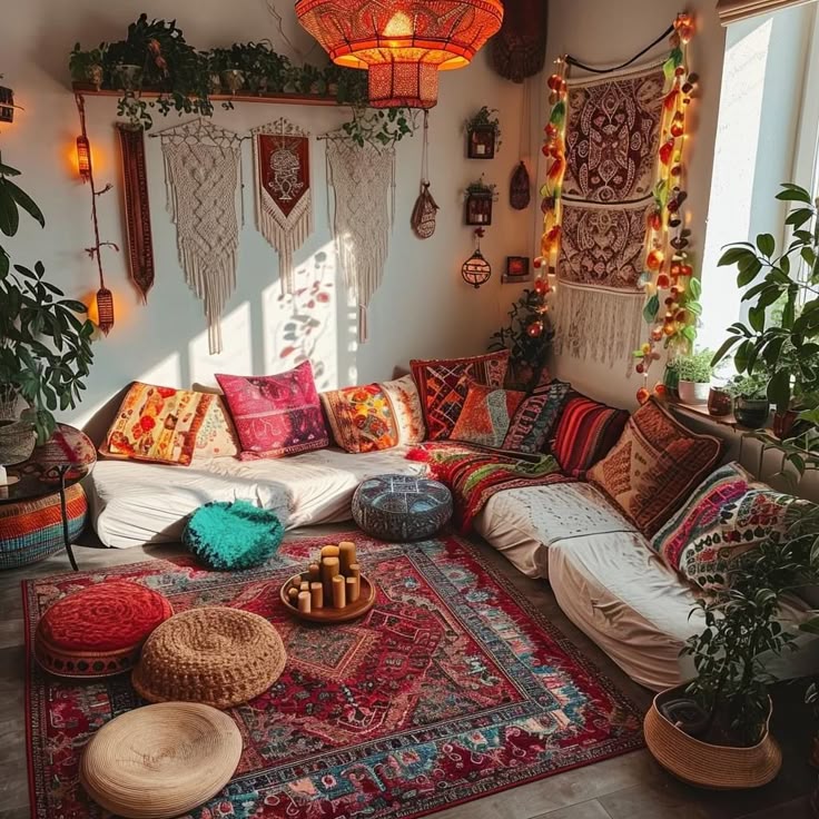 Boho selalu identik dengan karpet berlayer, motif etnik, dan warna-warna hangat. Layout tanpa sofa justru membuat konsep ini semakin hidup.